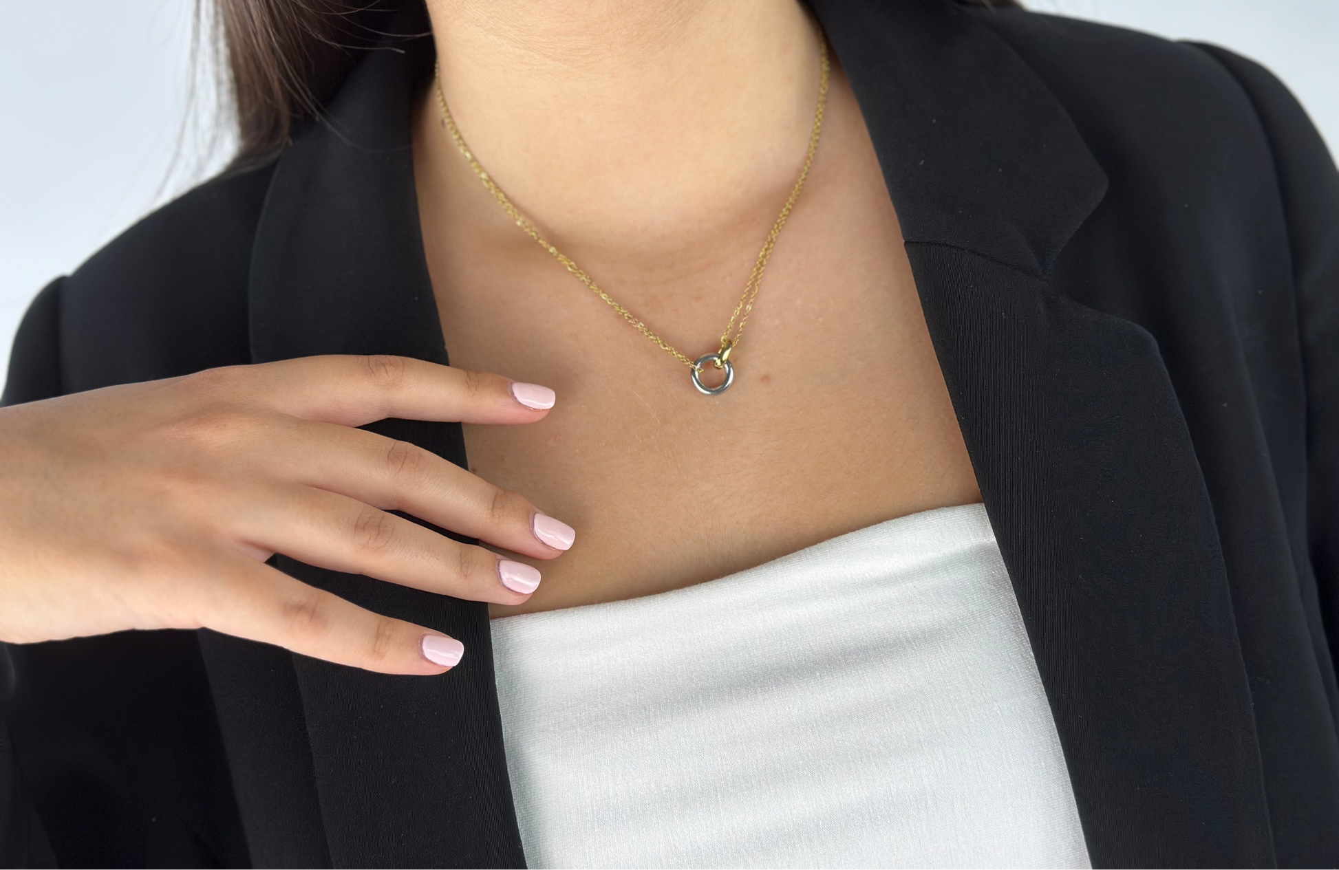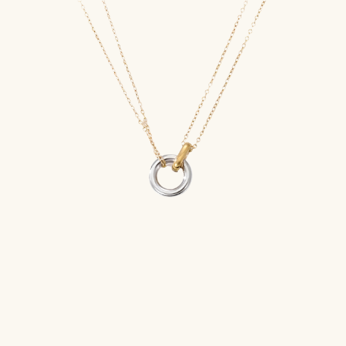 The Eternal Link necklace features two interlocking rings on a delicate double-chain design, symbolizing unity and connection. With its sleek, minimalist aesthetic, this necklace adds a touch of modern elegance to any outfit. Perfect for everyday wear or special occasions, it’s a timeless piece that beautifully captures the essence of unbreakable bonds.