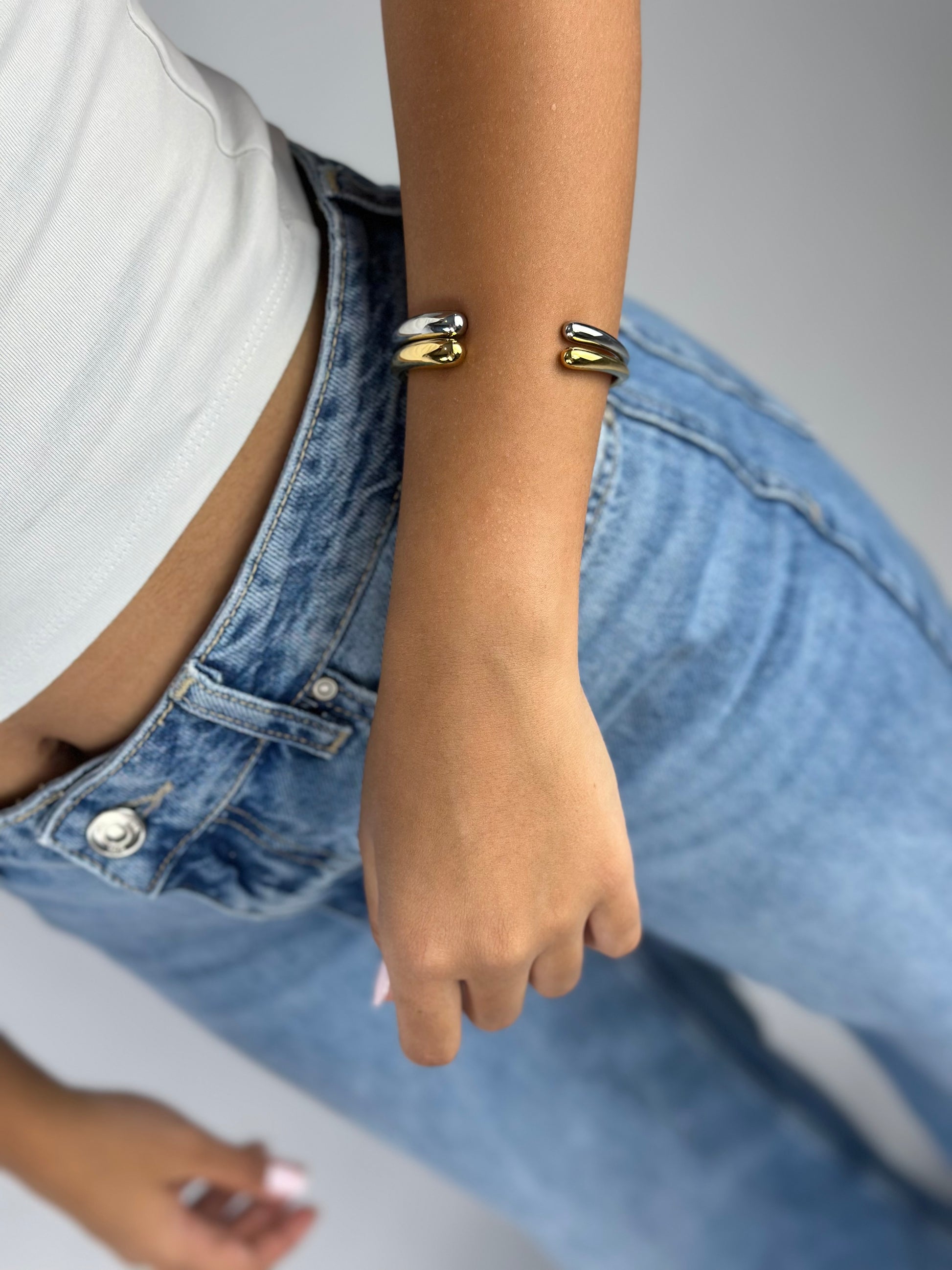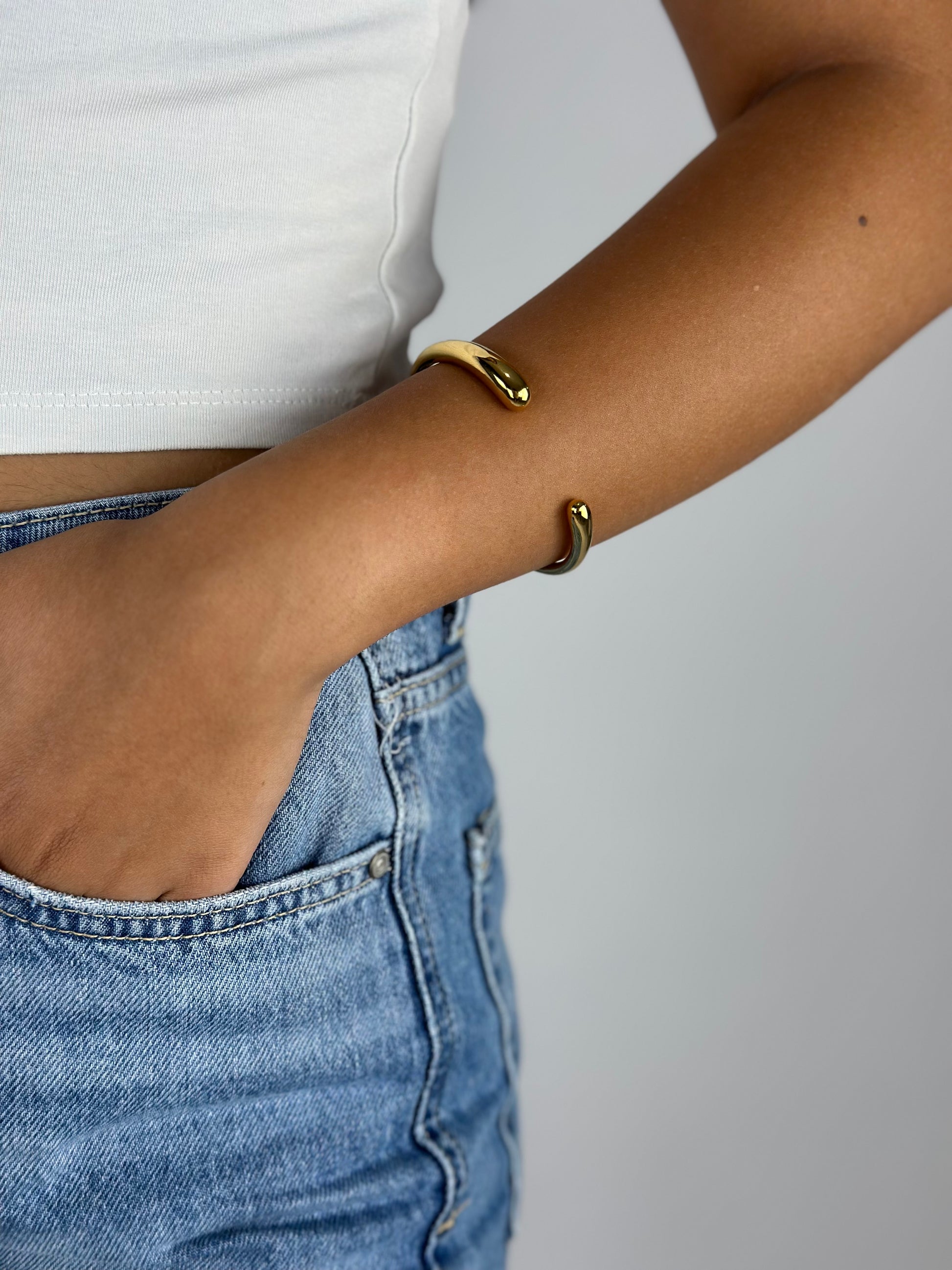 A minimalist open cuff bangle perfect for everyday wear or special occasions, offering a timeless accessory that can be easily paired with any outfit. The open design allows for a comfortable and adjustable fit.