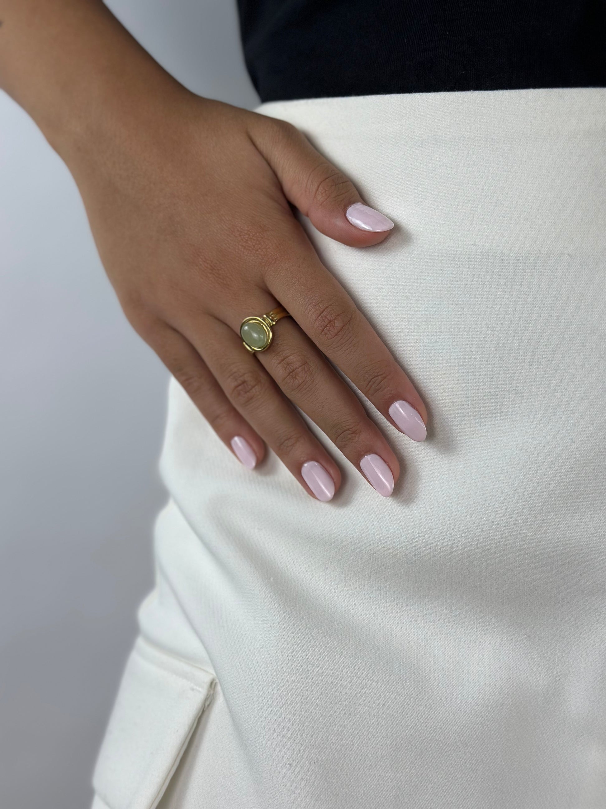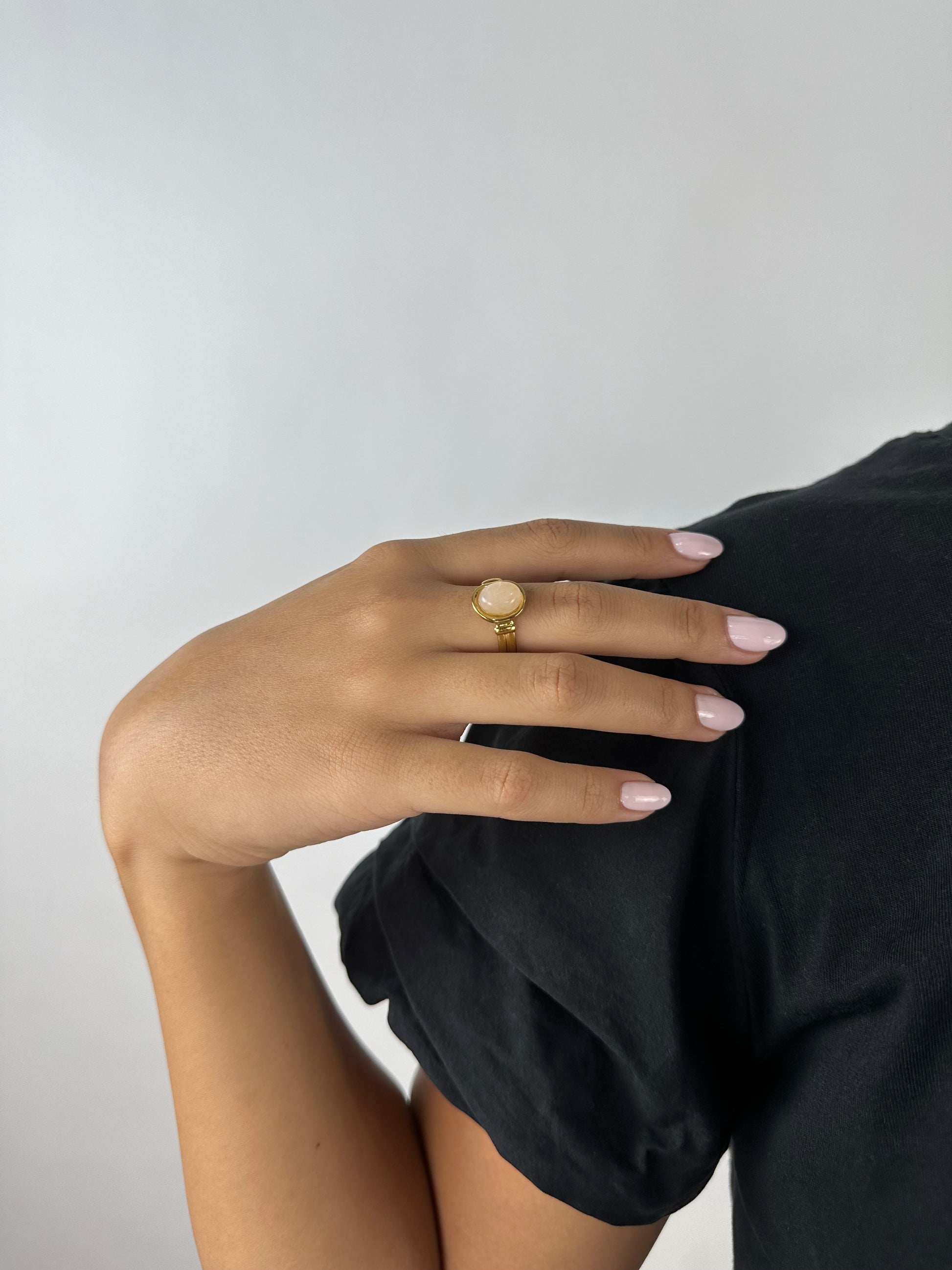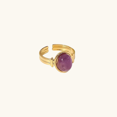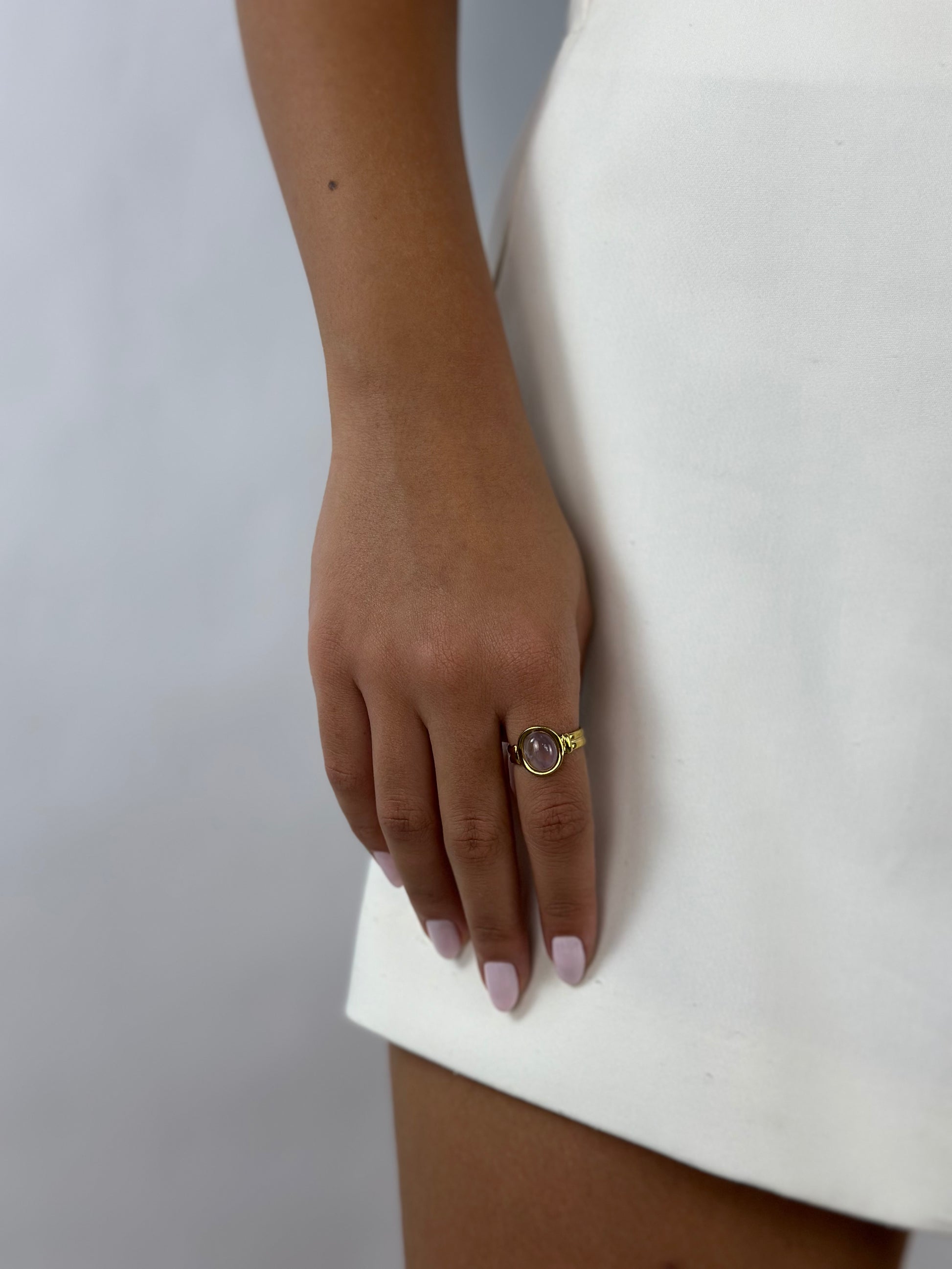 A bold, round gemstone set in a gold-plated, resizable band. With its sleek and modern design, this ring offers a striking balance between elegance and contemporary style, making it an eye-catching accessory for any occasion.