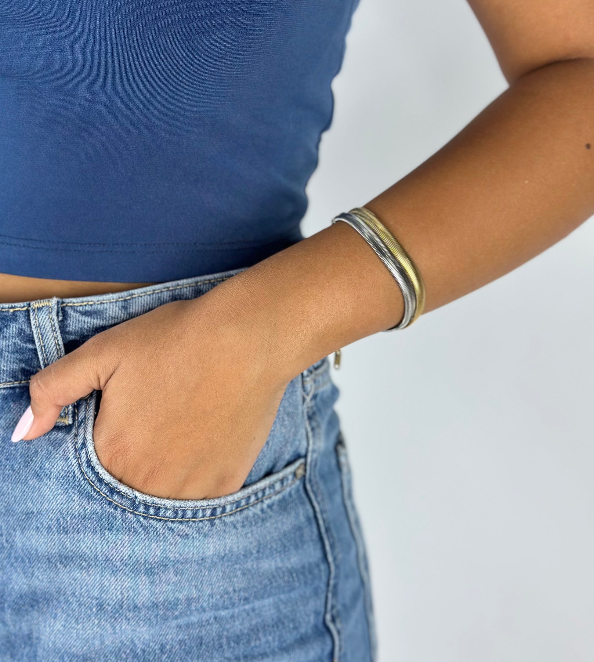 A coiled design that wraps elegantly around the wrist, offering a bold yet sophisticated look. Its flexible structure and refined finish make it a standout accessory for both casual and formal attire, perfect for those who appreciate modern, minimalistic style with a touch of edge.
