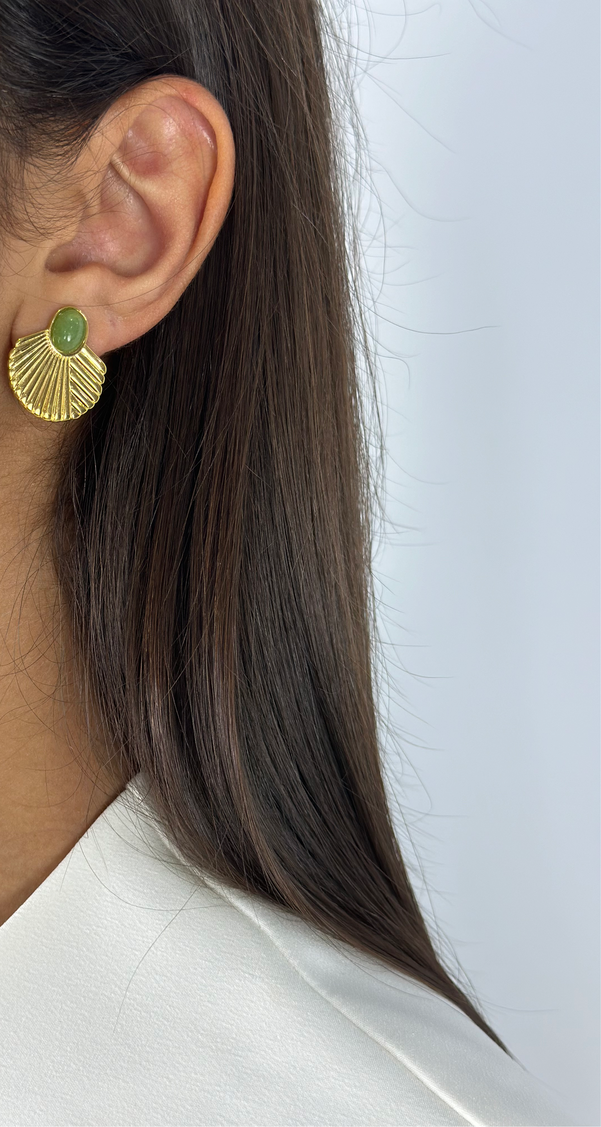 Elegant gold fan-shaped studs with a choice of green turquoise or tiger's eye gemstones. These versatile earrings add a touch of sophistication to any outfit.